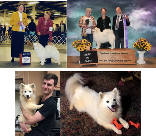 Dany is now UKC ChampionThunderpas Crystaltyme Daenerys and has earned her Trick Dog and Canine Good Citizenship titles. She has taken best of breed wins over AKC and UKC champions and grand champions, and won UKC northern breed groups and a Best in Show. She is active in agility training and going to be trying out FASTCAT, Barn Hunt and Herding Instinct in the near future.